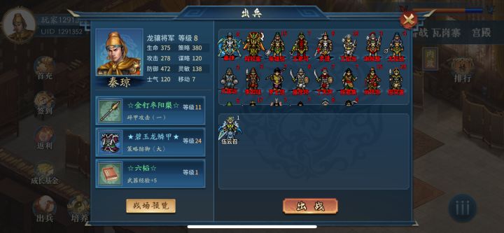 第一关 血染济南府宝物获得:瓦面金装锏(秦安自带)3642元宝只够买一个梅花亮银锤和细鳞白银铠和两本六韬,这里我先买了两本六韬,装备等需要的时候再买,前面我介绍了因为装备等级和人物等级有关。这关没什么好说的,经验控制在130-140就行(影响功勋获得),唯一要注意的是秦安不要升级了,要不然第三关秦琼出场就是5级。