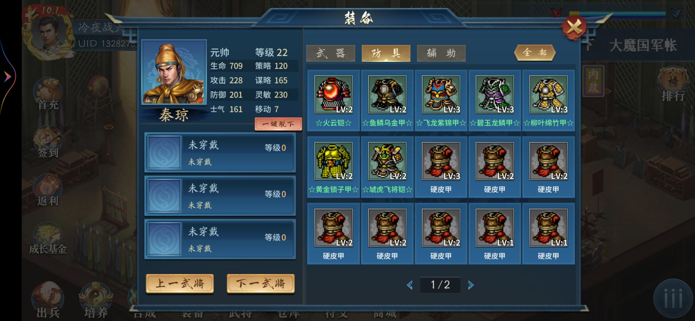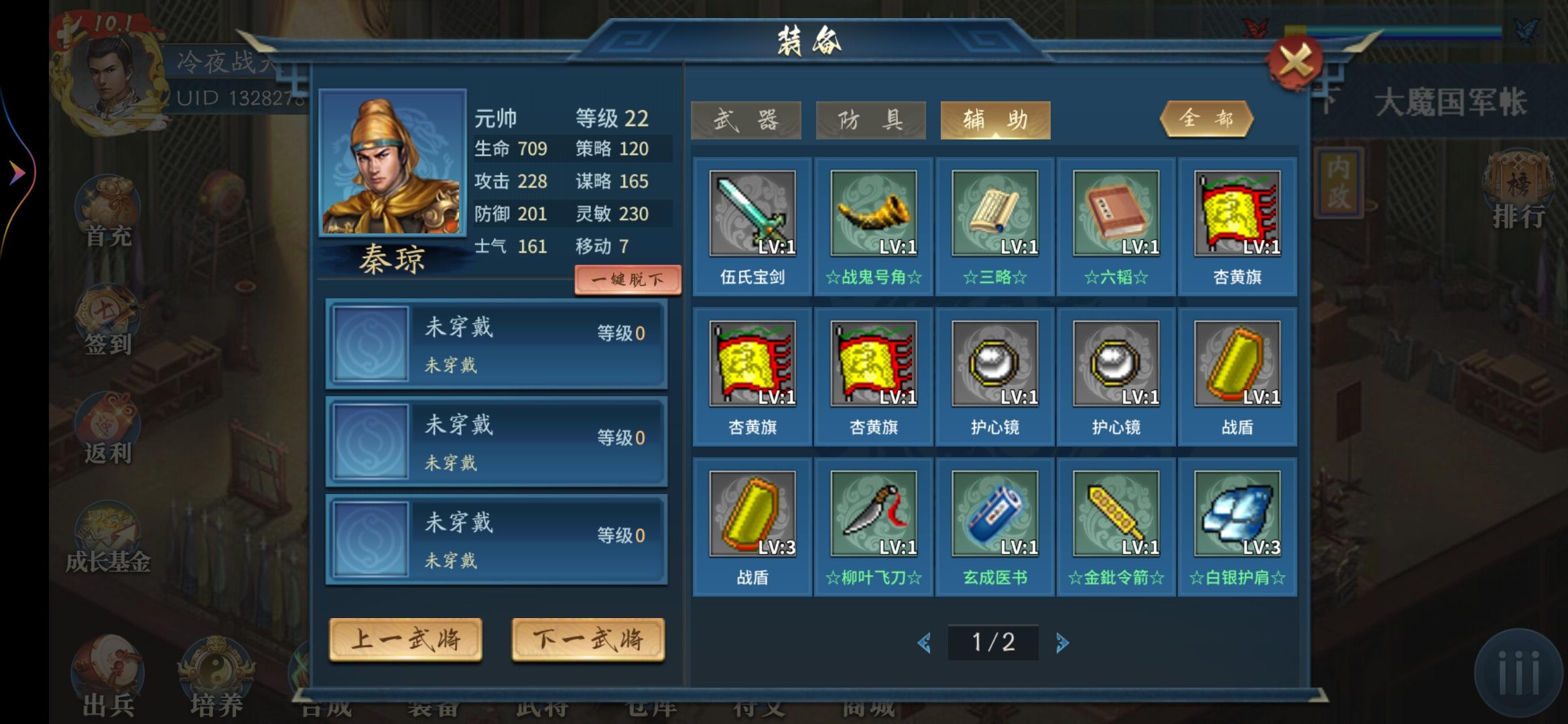 新人七天签到,刚刚开始第一次玩隋唐战旗游戏,感谢大佬们带来的元宝福利和平台礼包。贾家楼英雄聚会后,从商城陆续入手了1件飞将铠、6个六韬和2个三略辅助品(其中1个是功勋置换)。战前准备:金币商店中备齐25个豆子,2-3个花雕酒。侯君集在培养界面吃+1的属性成长点,把防御提档。程咬金 五钩神飞枪(1级) 普通甲 六韬单雄信 瓦面金装锏(3级) 普通甲 六韬王君可 八卦宣花斧(1级) 普通甲