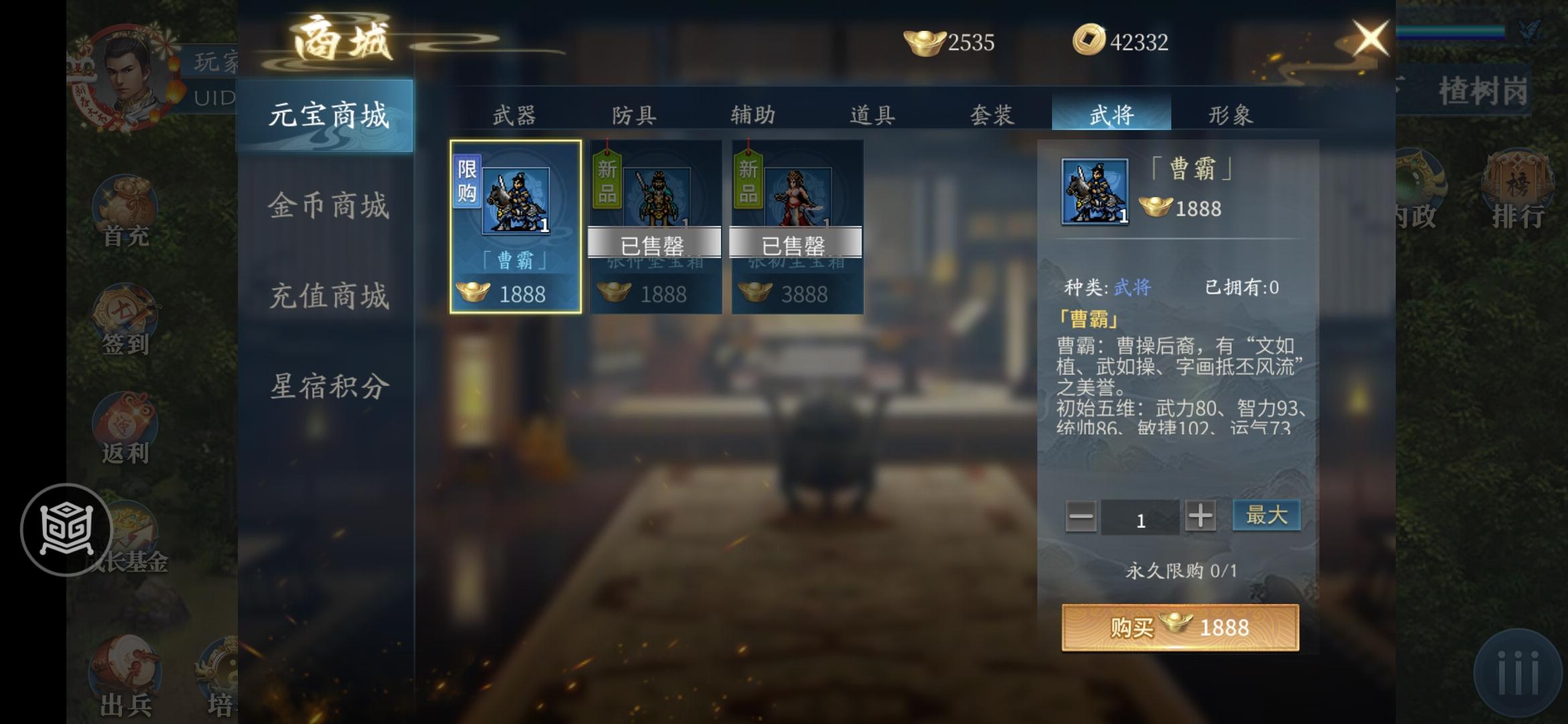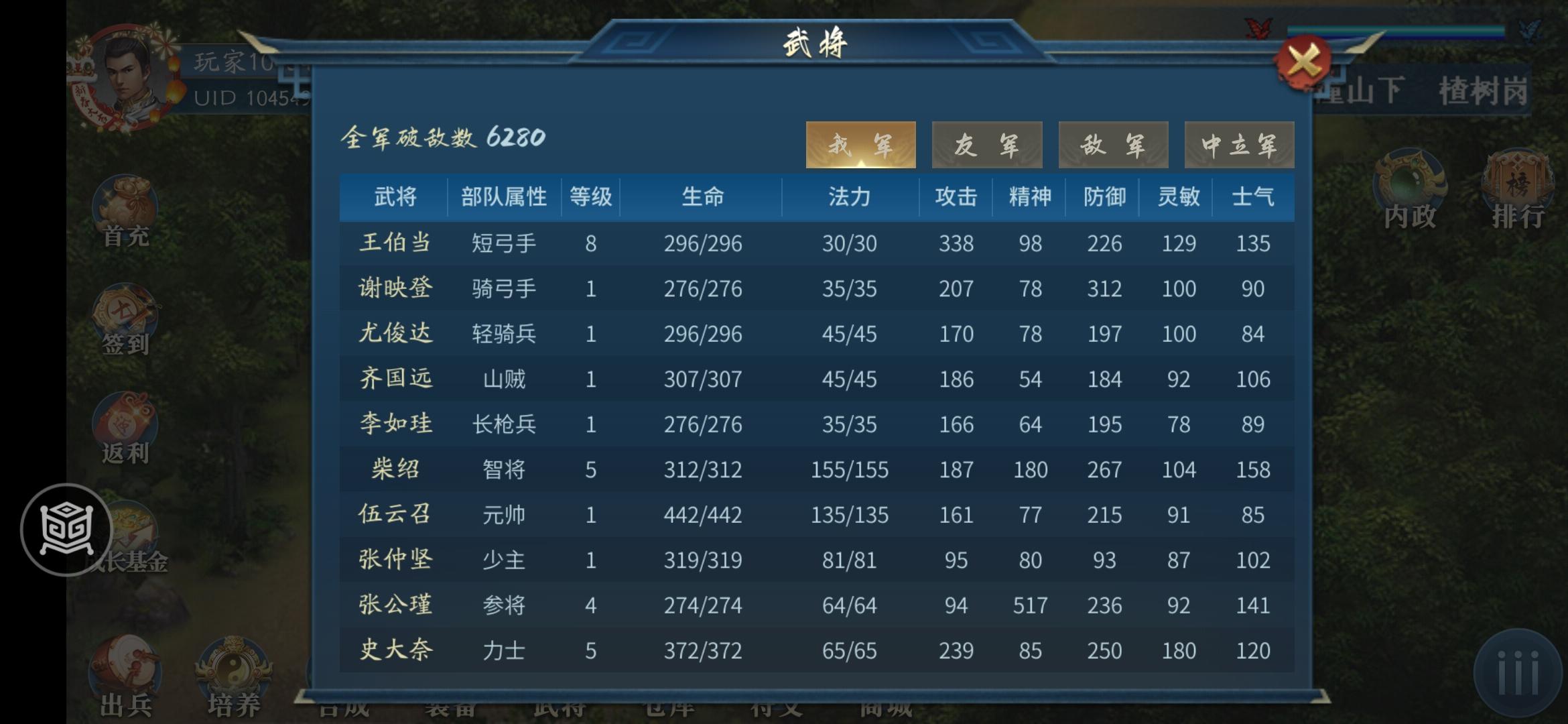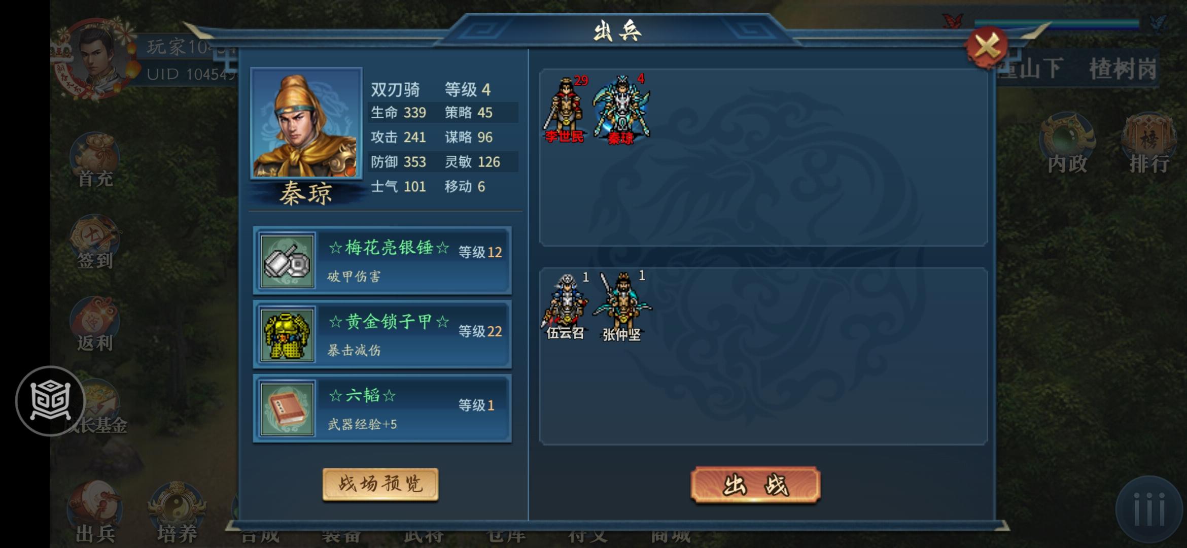 新人七天签到,刚刚开始第一次玩隋唐战旗游戏,感谢大佬们带来的元宝福利和平台礼包。贾家楼英雄聚会后,从商城陆续入手了1件飞将铠、6个六韬和2个三略辅助品(其中1个是功勋置换)。战前准备:金币商店中备齐25个豆子,2-3个花雕酒。侯君集在培养界面吃+1的属性成长点,把防御提档。程咬金 五钩神飞枪(1级) 普通甲 六韬单雄信 瓦面金装锏(3级) 普通甲 六韬王君可 八卦宣花斧(1级) 普通甲