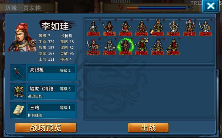新人七天签到,刚刚开始第一次玩隋唐战旗游戏,感谢大佬们带来的元宝福利和平台礼包。贾家楼英雄聚会后,从商城陆续入手了1件飞将铠、6个六韬和2个三略辅助品(其中1个是功勋置换)。战前准备:金币商店中备齐25个豆子,2-3个花雕酒。侯君集在培养界面吃+1的属性成长点,把防御提档。程咬金 五钩神飞枪(1级) 普通甲 六韬单雄信 瓦面金装锏(3级) 普通甲 六韬王君可 八卦宣花斧(1级) 普通甲