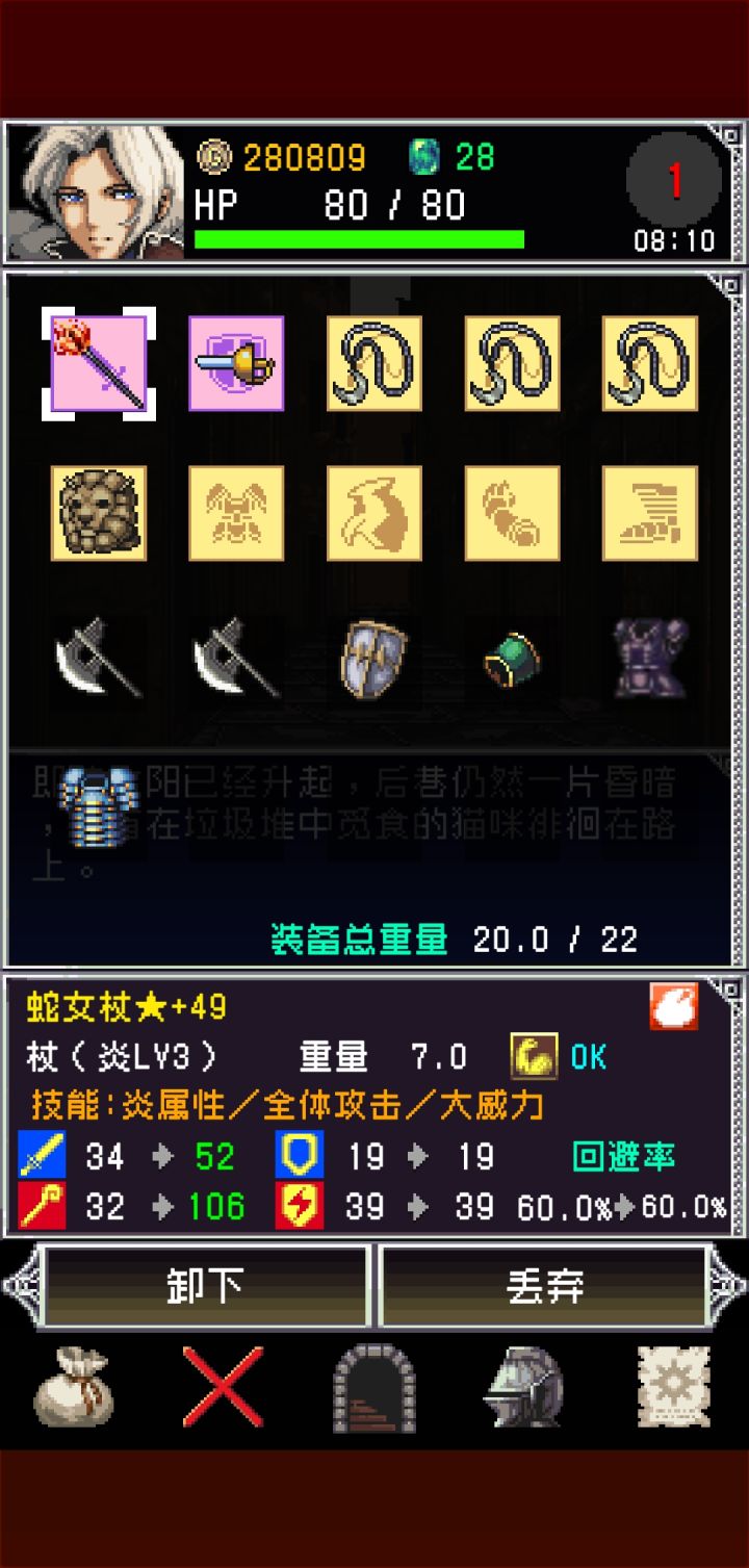 肝了一天,大致了解游戏,可能有的地方不对:基础:1.游戏首页教程一定要看,一定要看,一定要看2.可以对自己使用物理牌进行防御, 防御后不能进行打牌,盾牌有防御加成.3.战斗中每使用道具,或者换一个装备要废3行动点4.3级红治疗毒,4级治疗石化,5级万能5. 属性相克依赖武器,建议白银武器6. 敏捷和闪避相关, 闪避最高60%, 敏捷-负重=闪避7. 双手武器好像很废, 但是强化等级