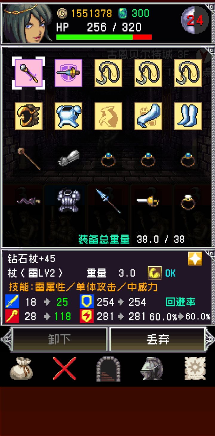 肝了一天,大致了解游戏,可能有的地方不对:基础:1.游戏首页教程一定要看,一定要看,一定要看2.可以对自己使用物理牌进行防御, 防御后不能进行打牌,盾牌有防御加成.3.战斗中每使用道具,或者换一个装备要废3行动点4.3级红治疗毒,4级治疗石化,5级万能5. 属性相克依赖武器,建议白银武器6. 敏捷和闪避相关, 闪避最高60%, 敏捷-负重=闪避7. 双手武器好像很废, 但是强化等级