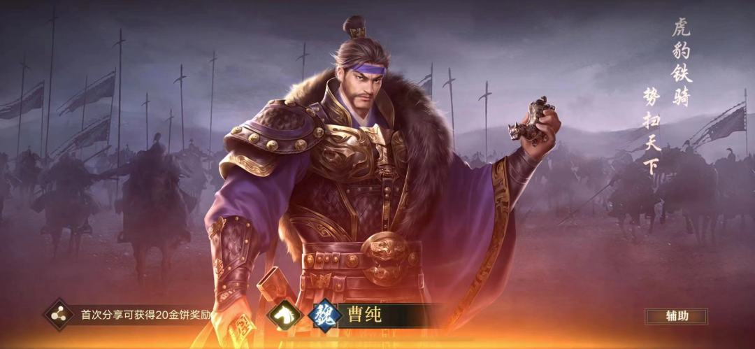 武将形象及主技能: 武将自拆宝物展示: 武将搭配思路: 魏*曹纯是魏国骑兵的核心辅助,其技能给全体魏势力角色普攻伤害加成45%,持续全场。还能使自身及1支友方魏势力骑兵以伏兵状态潜伏在敌方后侧,持续7.5秒,处于伏兵状态的部队还能获得全局免疫内讧效果,潜伏期间还能获得伤害减免30%(受统率影响),不过无法移动,普攻,释放主动技能。潜伏结束还能立即对3支敌方造成一次普攻伤害(600%伤害率,受武力影