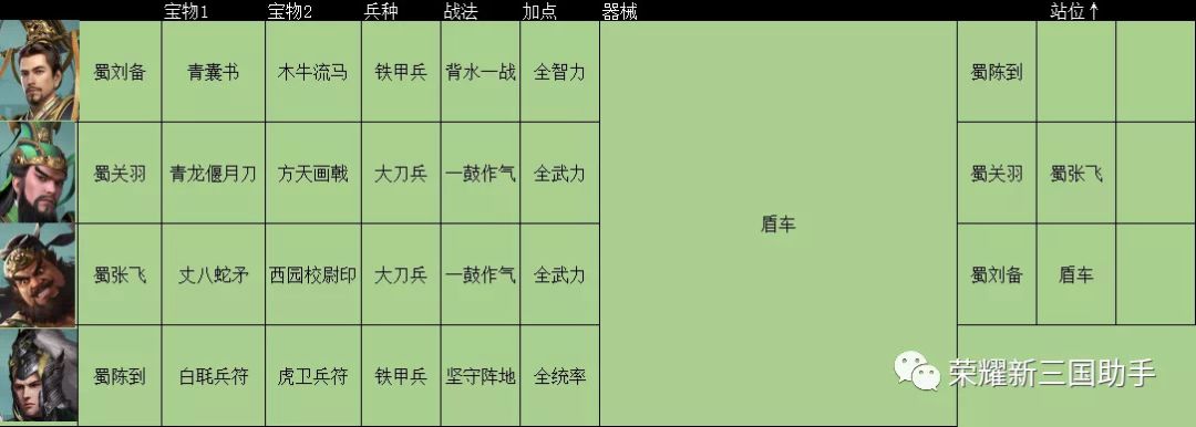 阵容搭配 配置思路①刘备在队伍内的主要作用是治疗+解控。其优异的技能也是目前为数不多的T0级武将,不过获取难度较高,同时也是众多队伍中的热门人选 ②张飞在队伍内的位置是半肉,需要注意张飞放的位置,尽可能靠近对方和队友,所以优先放在中间,尽可能的让技能效果拉满③关羽是主要输出点,需要配置全输出的武器使其最大化,其技能也是比较针对骑兵,使其应对四骑时有一战之力 ④陈到是队伍内的辅助+肉,也是骑兵杀手一