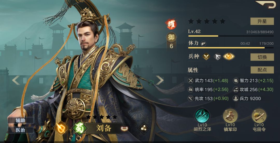 4. 刘备 中后期(七级及以后)开荒&练级神将。5 级地前由于野地主要靠普攻输出 所以刘备没什么优势(后排不掉血,治疗都浪费了),由于统御高所以前期不建议上。 统率和智力(智力也算防御属性)都很高,另外根据战报看,治疗量受兵力 影响较小(5000 兵减到 0 兵,大约还有一半治疗量),所以可以站前排。通常站 前排抗伤害。 自带技能治疗很高,免控特性聊胜于无,打架不要指望这个。 猜测减回复类技能/