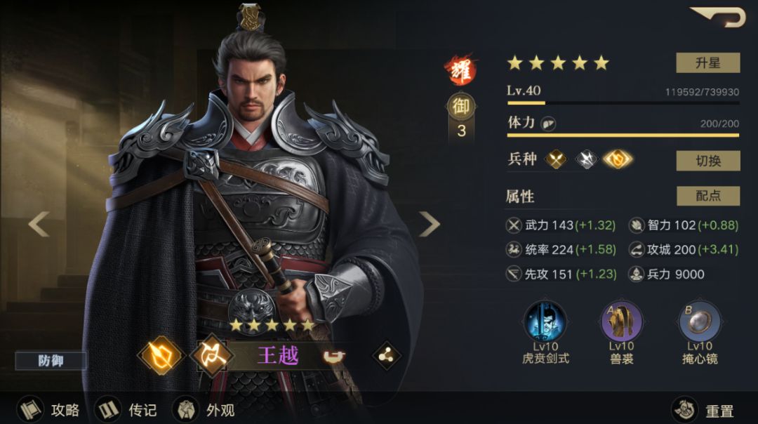 首先此文章针对是0氪玩家开荒,不是0氪的难以得到较好的文章体验。这个游戏开局会送我们王越+张燕。实话实说王越在新手期比大乔还要强力。 首先点满王越自带技能350的盾带嘲讽,3级土地守军才900兵力,王越一场至少会有700-1050的盾。相当于多了一条命。张燕虽然480%-720%的伤害倍率并不是特别高,但是相对于其他3御(除了马云禄,这个你前期搞不到)简直就是吊打好不好,哪怕孙尚香的伤害倍率也只是