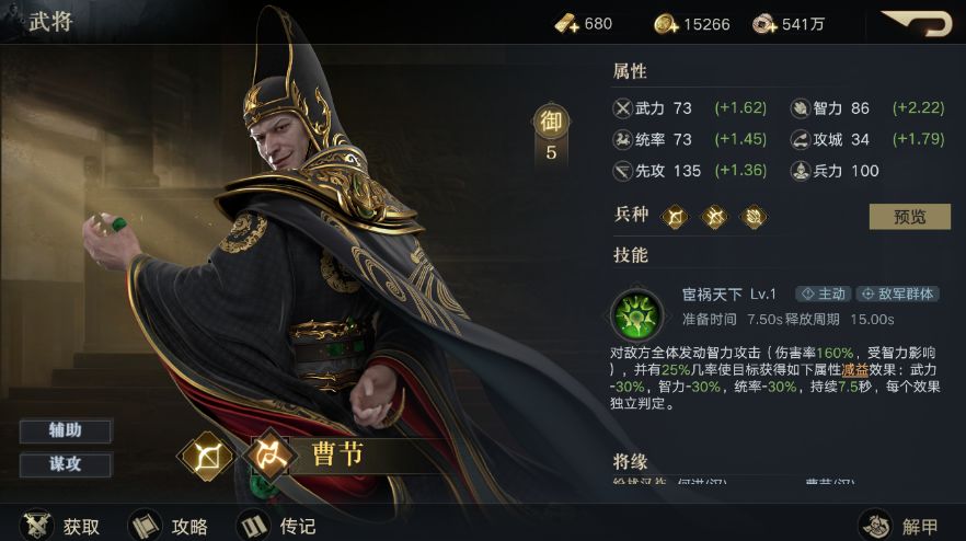 曹节 曹节,字元伟,谯(今安徽)人,魏武帝的曾祖父。 征服卡包出货率3.0365%(20抽综合出货率60%) 宦祸天下:15s间隔打一下1280%倍率伤害,并附带各种DEFF。对比文和弈枰理论上15s打1360%倍率。但是针对最低智力。综合来讲这个技能不是很强。 50级速度201,智力194。这个属性不是很理想。 普通说的就是他。 能拆的宝具有龟钮金印,现在没有强力的普攻队伍。并不实用,专门为了打