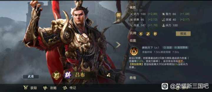 武力 372(+2.01)智力 193(+1.12)统率 226(+1.54)攻城 176(+2.15)先攻 176(+1.37)对随机2支敌方部队发动武力攻击(伤害率240%,受武力影响),并有75%几率夺取目标20%武力,持续7.5秒。对敌方全体发动武力攻击(伤害率440%,受武力影响)对距离最远的敌方部队发动武力攻击(伤害率850%,受武力影响),该次攻击附带50%命中几率,之后使自身