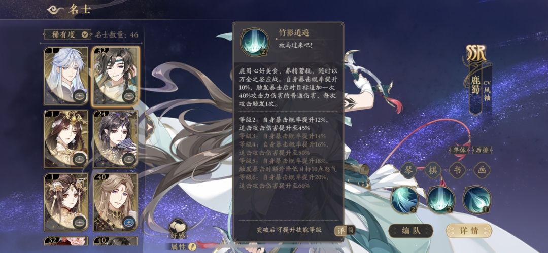 1、每周最少分享一次,获得50金叶子,设置生辰后,分享可获得1个花诏令。 2、在线60分钟,可获得银纹玉樱,是r,sr和ssr的通用突破材料,优先推荐用于ssr的突破。 3、ur突破除了该名士碎片,还有金纹玉樱,是通用的ur突破材料,大家可以通过签到和任务获得。 突破是提升名士技能等级的。 4、战斗时,记得开三倍速,左上角的设置可以跳过大招和特效。 5、竞技场中,先手值很重要,六个名士的先手值总和