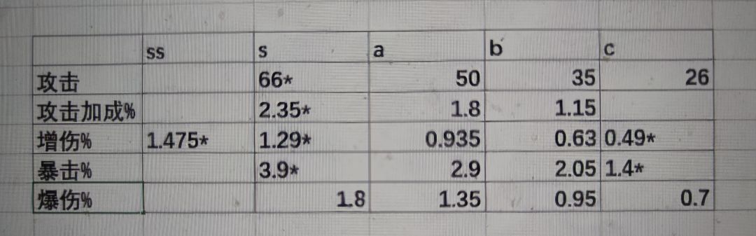 此次讨论结论较长,就不在前面先写了,想直接看结论的,下翻到加粗的部分。 花亦山中影响输出最终数值的属性有攻击、攻击加成、增伤、暴击、暴伤共5种。在没有其他buff的情况下,这些属性与最终伤害的关系如下:最终伤害=[基础攻击*(1+攻击加成)+攻击+万景集攻击]*增伤*伤害系数*目标总减伤系数,若暴击,则再乘上(150%+暴伤)。 为比较各个属性的收益区别,取四艺副属性中相同等级的副词条进行比较,通