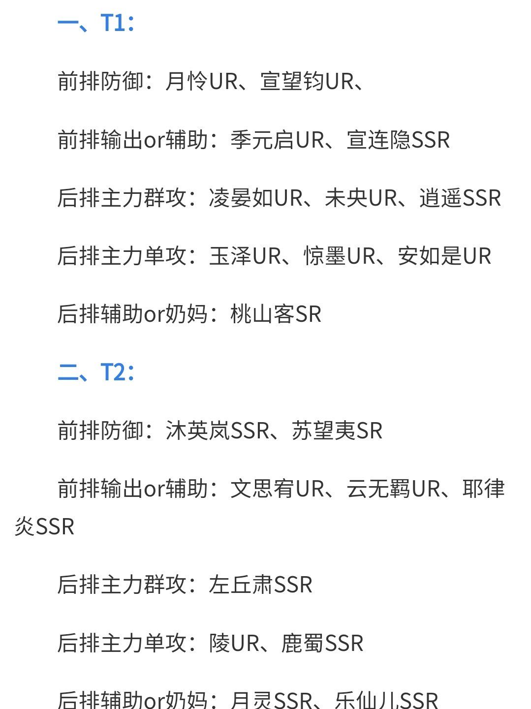 有几年回合制游戏经验,斗胆做一个强度排行,榜单盘点角色强度及站位推荐,如果有不恰当或不全面的地方欢迎指正 辅助 T0 季元启UR(小季yyds,集回血加攻加怒的万金油辅助,推荐站位1号) T1 桃山客SR(桃桃sr里的神,sr好养活,游戏内少有的全体回怒,可以说人手必养,放在3号位和季元启配合能快速给全队回怒,站位推荐3号,6号) 月灵SSR(功能性奶妈,回血量虽然不及月仙儿SSR,但是有复活有驱
