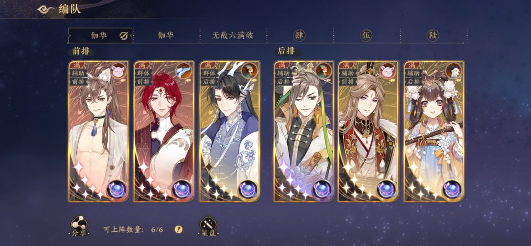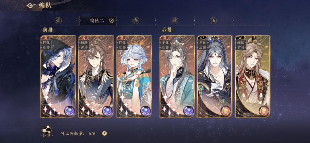 我想了很久,最终还是决定将他发出来(有啥不对的地方欢迎指正,不喜勿喷哦[表情_微笑] 咱们刚开始的时候就有啥用啥(不要在有一,俩个ur名士就来求配队啦),在拥有五个ur及以上,并确保有一个主c时,再来问 在新手开荒阶段(一直用到中后期),我就推荐俩套阵容:五保一队和常规队 五保一队: 配置如下(第一张图),咱们没有小季可以换上一个肉盾,最后一个位置换上贺之洲,我简单讲解一下,逍遥(首充就送,你不想