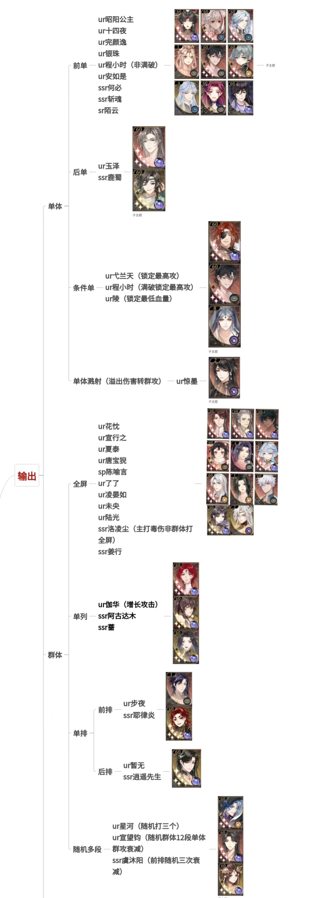 😈😈😈名士精细讲(1)😈😈😈 输出部分 p1是根据角色输出方式进行的常用角色和全部ur角色的分类。 👀👀不难看出,输出角色有单群之分或者二者兼有之。 但是在角色培养方面, (1)对于微氪玩家,建议以养成单体输出角色为主,全屏群体角色养成辅助功能型类别的。 (2)对于萌新前期优先养成低稀有度输出角色(突破高容易,且不浪费红玉稀有输出资源,不冲突),优先培养强力ur辅助(伽华除外——有直接拉满) (3)综上就是说全屏群体精养一两个,单体输出多养。 p2为重点具体养成图 关于为什么不建议养全屏群攻,和打多目标卡。(伽华例外) 1.送怒。 我想说的是无论是在pve,还是pvp,群体角色作为能攻击敌方全体的角色,相比于单体,有着送怒的极大缺陷,单体打一个角色一次给对面回10点怒气,而群体给对面大一轮回60点怒气,尤其对于哥哥多动的大招,给对面一次大招就可能回120怒——帮助对面快速开大,我放会减员很快。或者有人又会说了,有夏泰在,就不怕送怒了,但是养成夏泰的成本不亚于提高了红玉压力,氪佬没问题,但对于微氪党和萌新,会很大程度上提高养成压力。 2.刮痧。 全屏群攻的倍率一般都是单体的1/3左右,倍率越低被敌方防御稀释的就越多,打出的伤害就越少,尤其是在爬塔面对塔里的数值怪,很容易给他们刮痧送怒。全屏群攻的输出保证需要夏泰和优秀四艺的支持,而对于萌新,前期很难达到这样的标准,应该优先养成单体,无焦点的攻击很难使得对面减员而建立优势。 3.奶妈。 灵息的奶量和会武上场率相信大家有目共睹,还有路沧崖的护盾,很多时候全屏群攻在给对面送怒的同时打的伤害很可能是在给我对面刮护盾,尤其是在面对月怜的时候,过多的全屏群攻很难解决肉的和牛一样的怜姐姐,攻击没有重点使得浪费了很多伤害。 4.副本 大环境下的活动BOSS都是单体boss,而对于单体BOSS,单体伤害打在上面才是完全不会稀释的,而群攻打一个单体BOSS相当于打一个人,打出伤害很多时候都强差人意。为了追求活动低保更应养成更多单体。 萌新推荐养成: 【优先度最高】抽到就第一优先度养成的ur输出(可以喂红玉): ur伽华(增长型伤害,自回怒,自回血,自增伤,伤害的神) >ur昭阳公主(单体基石搭配卡,合攻群殴。) >ur弋兰天(最稳定硬控卡,pve普攻体系基石卡) >ur玉泽(看情况,是在没单体ur就养,前期挺好。) 前期过渡主力(不吃红玉的输出): sr陌云(被动解决四艺暴击,攻击压力,伤害十分可观,养成压力小。) >ssr耶律炎(增长性攻击,自回血,暴击加成,持续站场后伤害爆炸。) >ssr何必(单体伤害可观,增益优秀。)。 中期主力(四艺条件稍好,伤害进阶。): ssr耶律炎,ssr阿古达木(暴击输出爆炸💥)ssr洛凌尘(打群体不给怒气,毒伤稳定,爬塔,副本速攻一波流) 全屏群攻推荐(中期): ur夏泰,(群攻基础卡,完美解决群攻送怒和伤害问题,本身也是站的住的前排) ur糖宝猊(辅助增伤)。 ur花忱(满破会武神卡,按死回怒)。 ur宣行之(会武高端局控制卡)。 ur了了(画境神辅助)。 老玩家大后期进阶:ur十四夜(暴击的神,能打能奶能团队回怒) 个别用途输出[揣手]: 宣望钧——不拉红玉,拉阶等级即可。(清灵儿必备) 云无羁——伽华以下第一输出,也看脸,会武可以换。(因为会武可以换不建议用玉养)