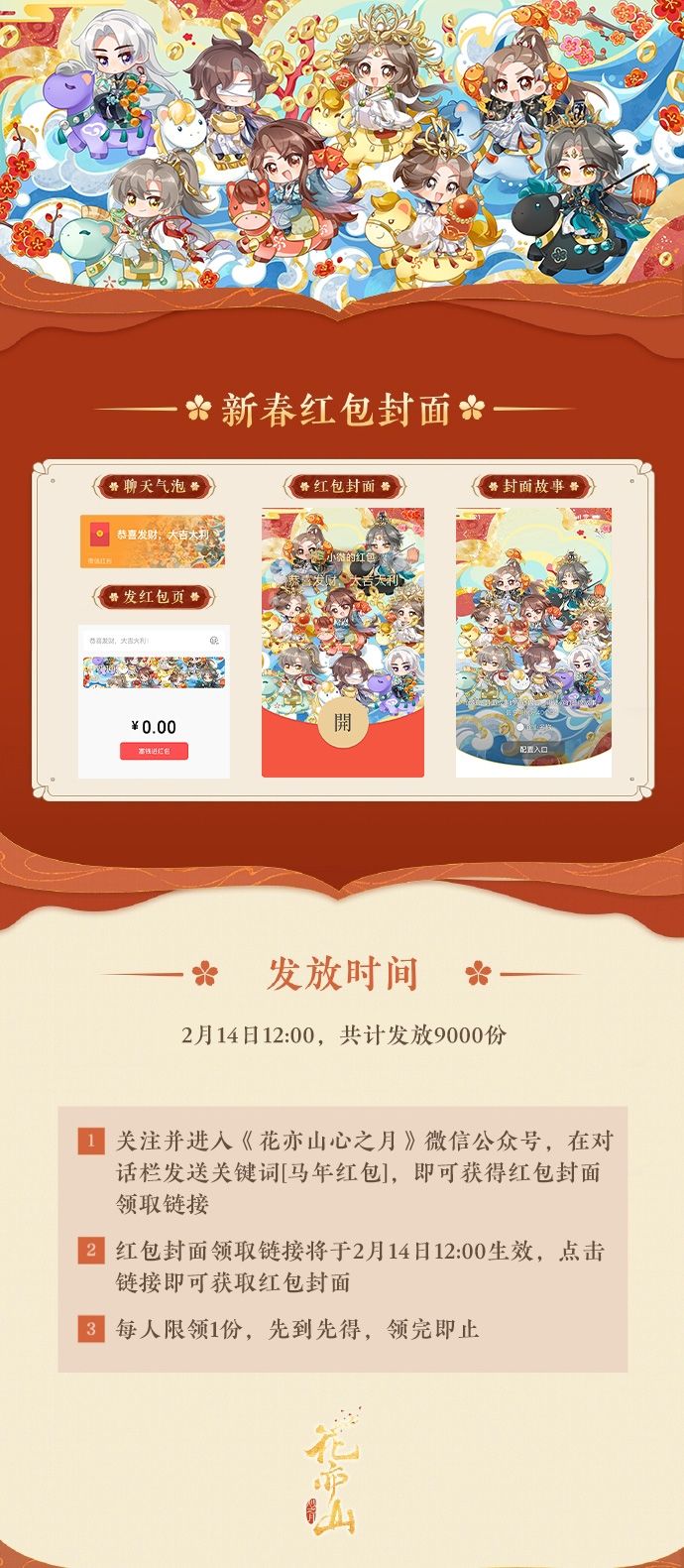 踏月巡宵千万里,春潮携福叩门台。《花亦山心之月》新春微信红包封面即将发放,快来领取你的马年新春红包封面吧! 🐎领取账号:《花亦山心之月》微信公众号🐎领取时间:2月14日 12:00 🐎领取流程:1.关注并进入《花亦山心之月》微信公众号,在对话栏发送关键词【马年红包】、【红包】 或【红包封面】,即可获得红包封面领取链接2.红包封面领取链接将于2月14日 12:00生效,点击红包领取链接
