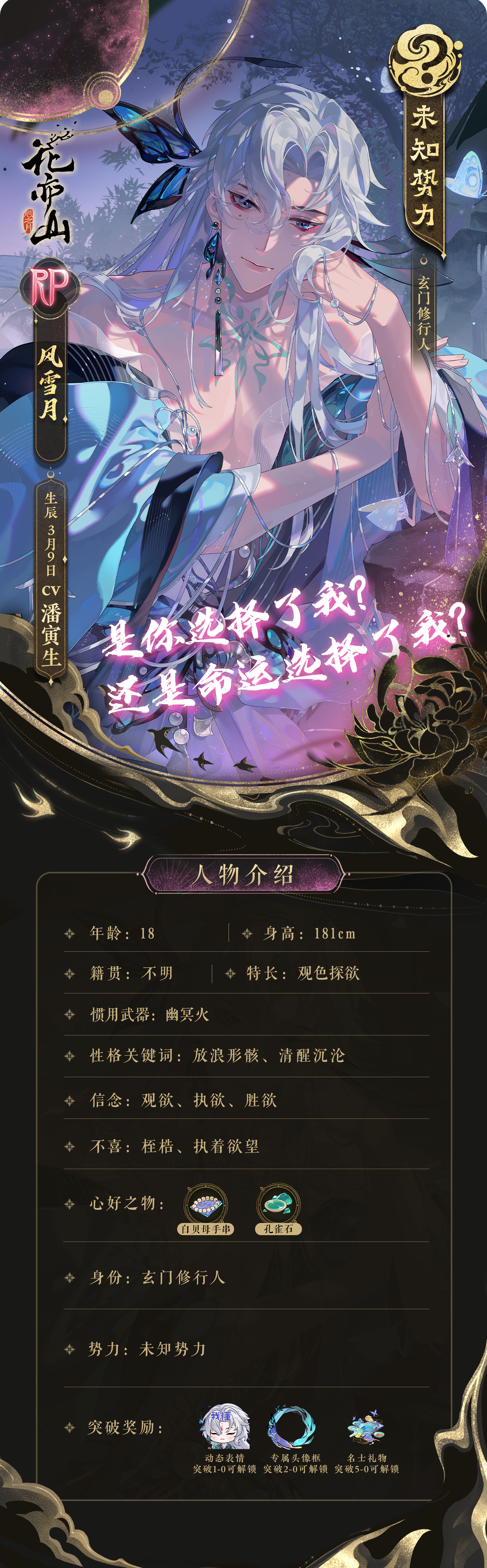 ——“是你选择了我?还是命运选择了我?”名士:风雪月配音:潘寅生*角色技能请以游戏内为准>>>“欲渡春时”版本主题活动正在进行中,欲渡此心,莫负春时。