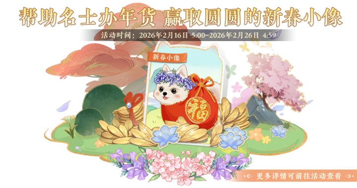 书院,好热闹!人,好忙!人,发生了什么吗?有什么可以让圆圆帮忙的吗? 新春佳节,人见人爱、善解人意的圆圆它又来啦!🐶看着人们忙碌的身影,圆圆也迫不及待想要贡献出自己的一份力量!快和圆圆一起置办年货吧!🐾 活动时间:2026年2月16日5:00 - 2月26日4:59活动说明:活动期间,根据名士们的需求置办年货,可获取金叶子和【小花朵朵】等丰厚奖励,完成活动任务还可获得【圆圆的新春小