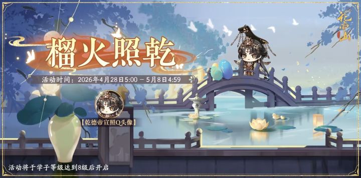 荷塘榴火,烛照乾坤。与乾德帝宣照一同共赏季春美景吧~榴火照乾活动将于4月28日开启,更多具体活动内容可前往游戏内体验。 活动时间:2026年4月28日5:00 - 5月8日4:59活动说明:活动期间,学子参与,可获得乾德帝宣照Q版头像、花诏令、金叶子、银纹玉樱等奖励,详细活动规则可见游戏内说明。*活动将于学子等级达到8级后开启 >>>🌺游戏下载:https://www.taptap.