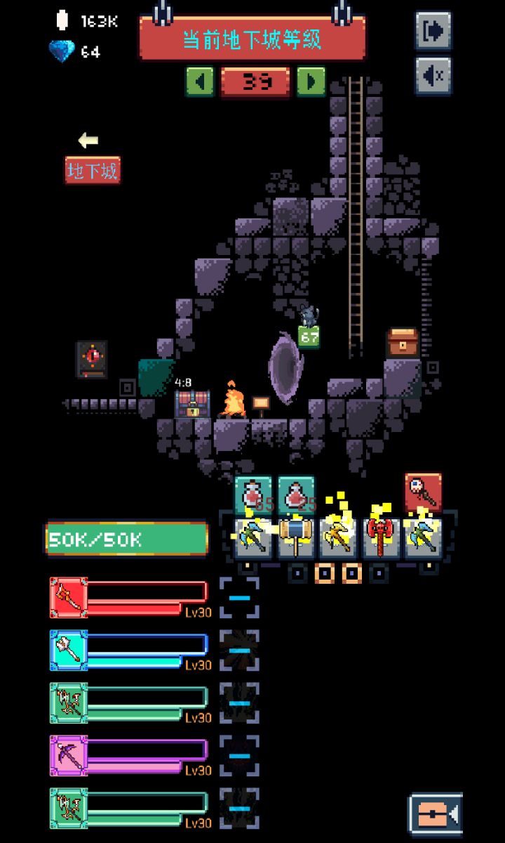 2D像素风画面的单机独游,己方看不见角色,只有职业图标,怪物造型千奇百怪,几个BOSS印象还是挺深的,小兵基本记不住。界面UI有些混乱和紧凑感,不是很美观,有提升空间。效果意思表达基本准确,容易理解。