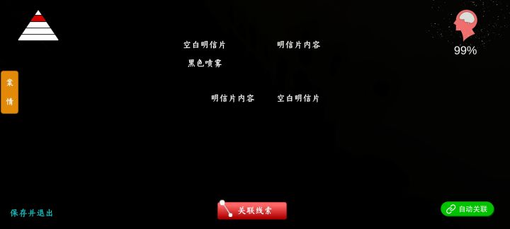 高能预警:拉开窗帘,皮上时钟点一下有鬼影出现。物品:1.水龙头在赵卫材家厨房2.D-23+在赵卫材家单人床里面,电视机点一下就能挪开。线索:1.D-23+ +水龙头——合成D-23+2.阴阳环+水龙头——清洗阴阳环3.时钟时间是7:154.黑色粉末+白色喷雾——粉色喷雾5.绿/黄/粉喷雾——黑色喷雾6.回去空白明信片处点一下会出现内容,有两张明信片,一张在鬼头刀插着房间内,一