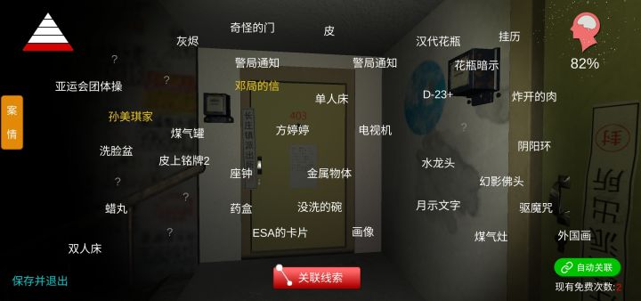 高能预警:拉开窗帘,皮上时钟点一下有鬼影出现。物品:1.水龙头在赵卫材家厨房2.D-23+在赵卫材家单人床里面,电视机点一下就能挪开。线索:1.D-23+ +水龙头——合成D-23+2.阴阳环+水龙头——清洗阴阳环3.时钟时间是7:154.黑色粉末+白色喷雾——粉色喷雾5.绿/黄/粉喷雾——黑色喷雾6.回去空白明信片处点一下会出现内容,有两张明信片,一张在鬼头刀插着房间内,一