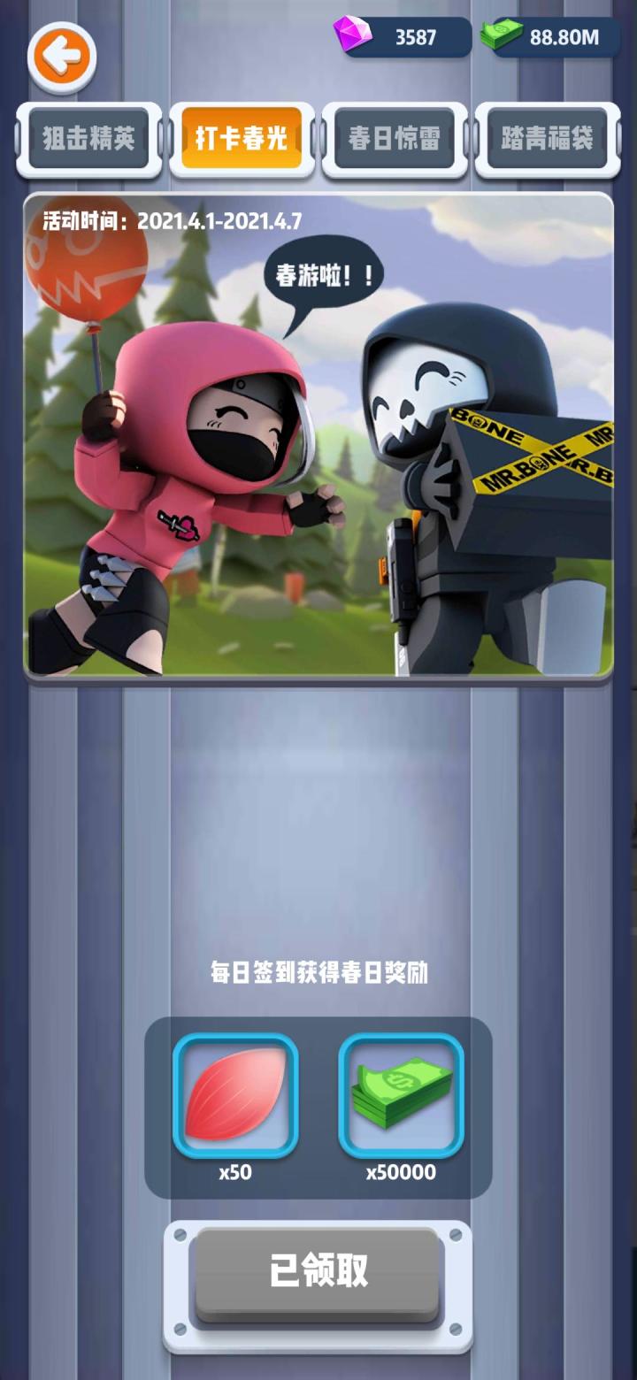 各位正式特工们;前几天,因为大都会的春季到来,万物复苏,加上前几个月大家为了大都市的安全做出了巨大的风险,所以局里特意给大家放了七天春日假期,同时还给各位特工准备了丰厚的踏青礼物。今天是春假的第六天,本局长特意去看了下后勤部的踏青礼品库存,按理说这些事不需要提的。不过现在,六爷我觉得有必要给大家说下,踏青礼物究竟有哪些好东西。现在新武器新皮肤是不吃香了吗?怎么还有这么多库存没人换的?首款狙