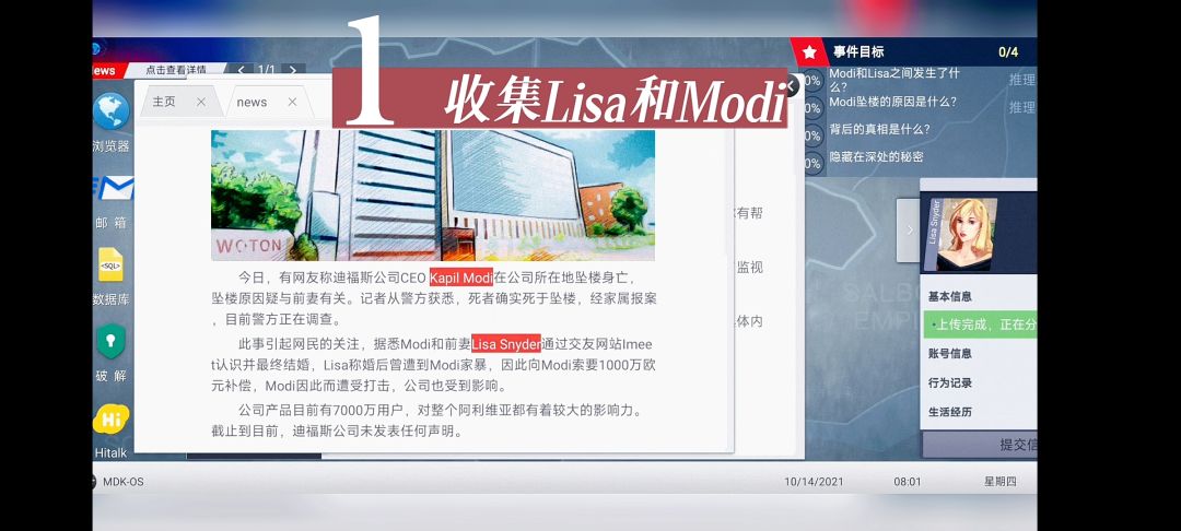 眼睛没看清楚以为视频可以,结果发现不行 点击链接进入报道页面,如下 得到Lisa姓名,依次收集,如下 获得了Lisa的邮箱和hitalk后,如下 拿Lisa邮箱登录她的toothbook,如下 拿到walker电话号码打电话给他如下,选“实话实说” 选“关于Lisa”,如下 通过推理后得到公司名defoss,如下 得到modi的邮箱地址后,如下 得到客户carter的hitalk后,如下 通过推理