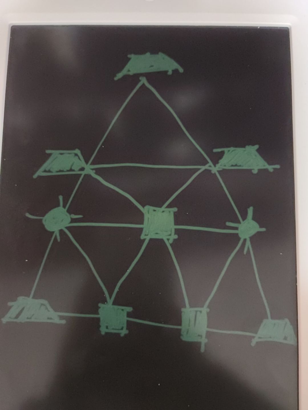 需要懂的:按两下等于没按,所以一个格子要么按要么不按。 把图斜转45°(随便往哪转) (为什么?在正方形网格中,点一下会改变上一行,下一行和同行的格子状态,但是如果斜过来,就可以看成只改变上一层和下一层的状态。) 从上到下找到第一层有未亮灯的点,通过点下一层(图中横线)的格子(左下,右下)来点亮它。保证在不改变上一层状态的同时点亮这一层。 由于一格只能存在按或不按两种情况,则每步解法也只有两种情况