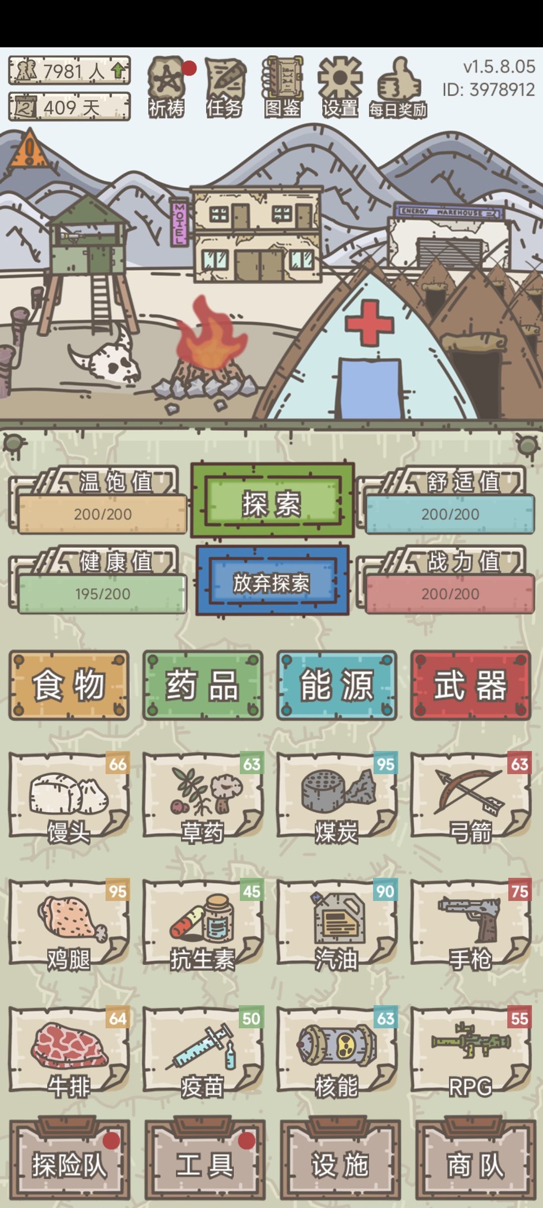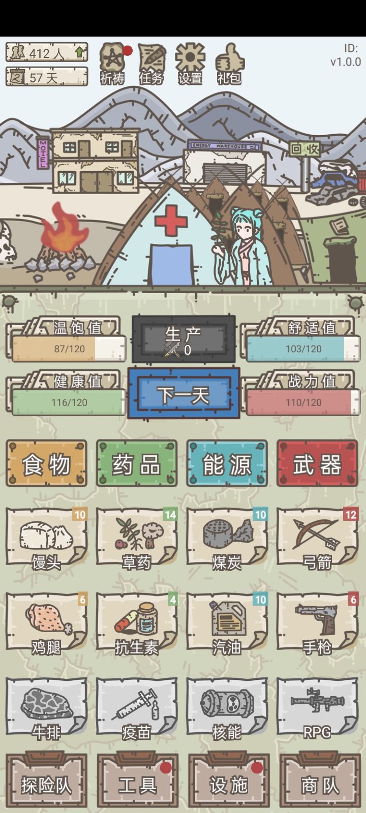 57天,地图到惠山县,游戏整体来说比较简单,一句话,一切看脸,真的很看脸(所有地图都是随机的,包括事件,你的前进步数,还有黑商和酒馆招募)前期资源不是很缺,因此礼包码先不要领,否则会出打劫,3天内把指定物资消耗一部分(比如说你能源过多,那么你要在3天内消耗掉一部分,至于消耗多少……比较多,反正3个级别的物资要10以下)如果到时间没消耗掉,那么之后3天会减少指定的属性(比如能源被抢就是3天舒适度-3