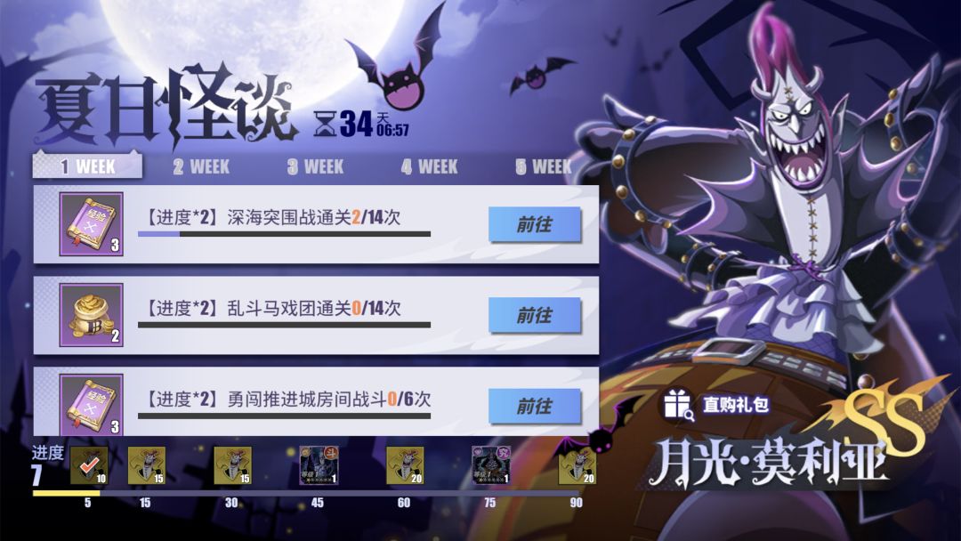 影子之果能力者、恐怖之船船长莫利亚终于在游戏中登场啦!他是继黑足·山智之后,游戏为船长们带来的第二个免费SS伙伴,只要参与“夏日怪谈”主题活动,就能免费获得,这波“真香”福利,怎么能白白错过?! “夏日怪谈”主题活动将分为5周进行,船长们完成任务就能获得任务进度,达到阶段目标后,能领取一定数量的莫利亚碎片,满50碎片就可以免费召唤莫利亚! 建议各位船长从第一周做起,除了能召唤莫利亚,还能获得额外的