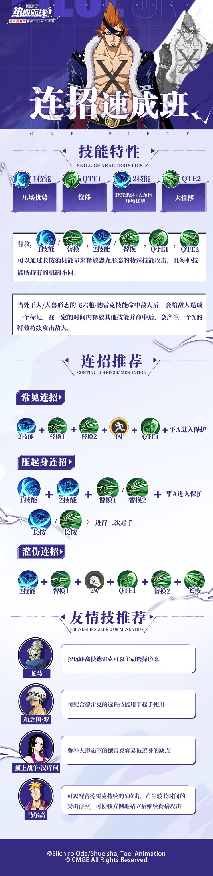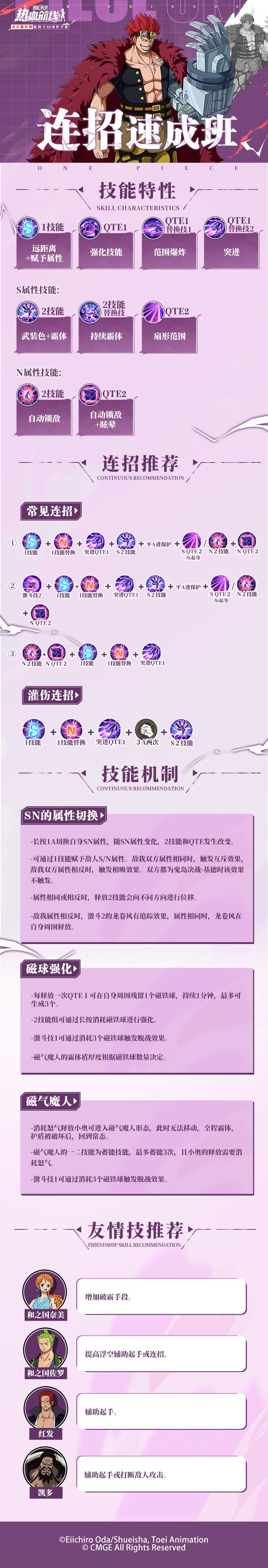 ⭐「鬼岛决战·基德」连招图⭐ 全新传奇伙伴鬼岛决战·基德现已登场!更多技能机制以及实战连招一图揭晓! 复杂多变的机制,带来的是超高的实力上限!他可以通过向对手赋予N属性或者是S属性来配合攻击,拥有远距离、突进、武装色等多种强大机制。更可以通过奥义切换为磁气魔人,改变技能释放形态,增大技能范围! 和乔小巴一起掌握伙伴更多战斗细节,在竞技场上一击制胜吧! 热血航线福利官可雅酱堂堂登场! 每月固定福利礼