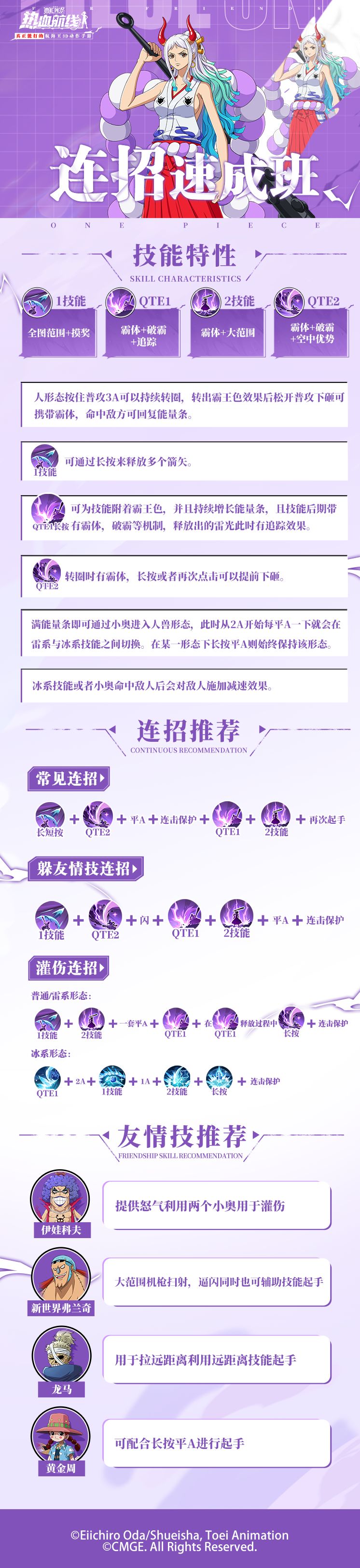 ⭐大和连招一图流⭐ 船长们的攻略小助手乔小巴来啦!今天为船长们带来的是新伙伴「大和」的连招秘籍!兼具冰系和雷系以及人形态三套技能的她,究竟在竞技场上有什么绝招技巧? 作为一位进攻性极强的伙伴,她的大部分的技能都有能够单独起手的能力,再加上两个玩法截然不同的激斗技。能抗能打,十分全面!快戳长图了解这位鬼公主的正确打开方式,在实战中刮起冰雪风暴吧! 热血航线福利官可雅酱堂堂登场! 每月固定福利礼包、不