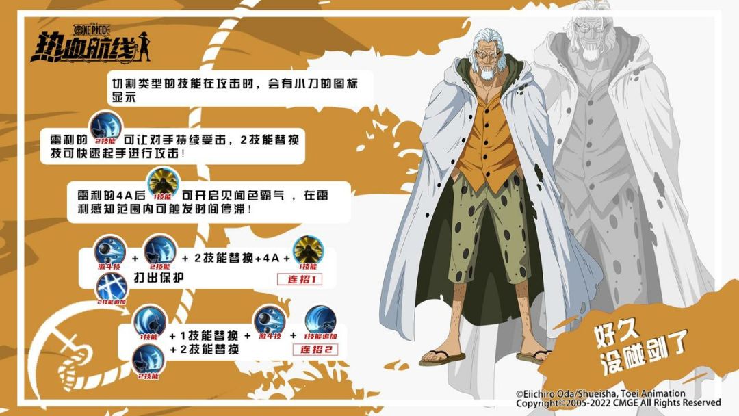全新传奇伙伴「雷利」现已登场!今天为大家带来的就是雷利的连招攻略详解! 作为航海王的左膀右臂,他能自在地使用包括霸王色霸气在内的所有霸气,实力强大不减当年。 在游戏中,运用2技能快速起手的同时,他的普攻还可无缝衔接持续让敌人受击,且攻击距离较远。4A后打出一技能还可开启见闻色霸气触发时间停滞。 本期连招速成班,乔小巴为船长们总结了一些雷利的实用技巧和连招心得,希望能够帮助各位船长快速上手新伙伴,在