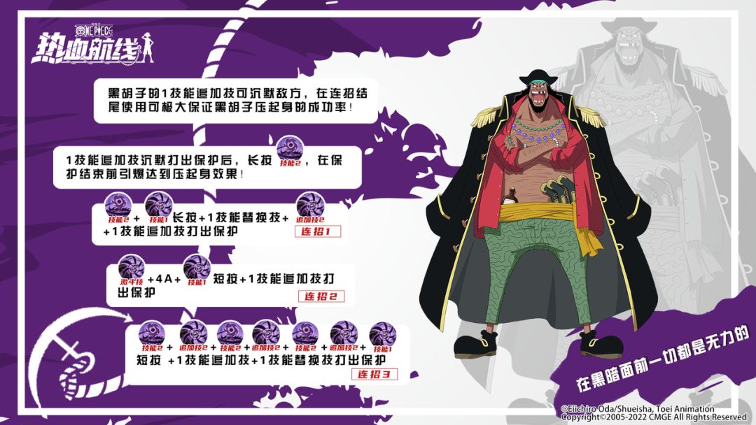 全新传奇伙伴「黑胡子」现已登场! 作为黑暗之果的能力者,拥有据说是“恶魔之果”历史上最为凶恶的能力,是不停篡夺越变越强的大航海时代的宠儿。 在游戏中,运用1技能释放旋涡状的黑色气旋,他能击破敌方霸体和元素化状态,还能利用追加技直接沉默对手,达到压制效果。且能同时引爆3颗黑球陷阱对敌方造成攻击,伤害范围巨大。 本期连招速成班,乔小巴就带来了黑胡子的连招攻略和一些实用技巧,希望船长们都能快速掌握并在战