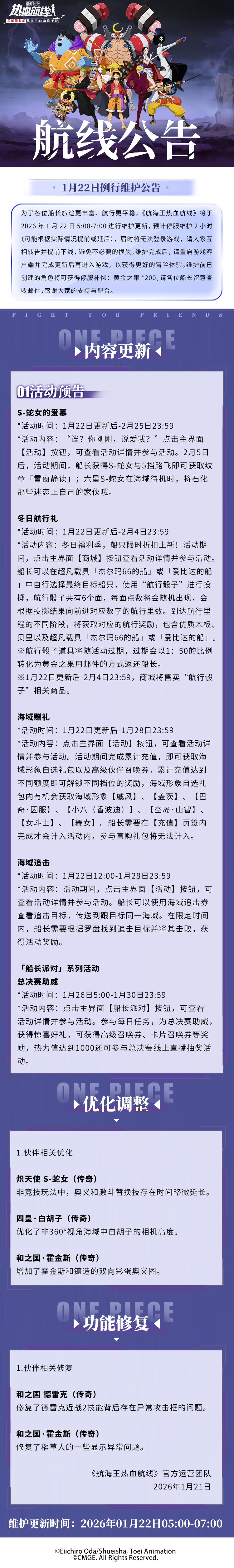 ⭐1月22日例行维护公告⭐为了各位船长旅途更丰富、航行更平稳,《航海王热血航线》将于2026年1月22日5:00-7:00进行维护更新,预计停服维护2小时(可能根据实际情况提前或延后),届时将无法登录游戏,请大家互相转告并提前下线,避免不必要的损失。维护完成后,请重启游戏客户端并完成更新后再进入游戏,以获得更好的冒险体验。维护前已创建的角色将可获得停服补偿:黄金之果*200,请各位船长留意查收