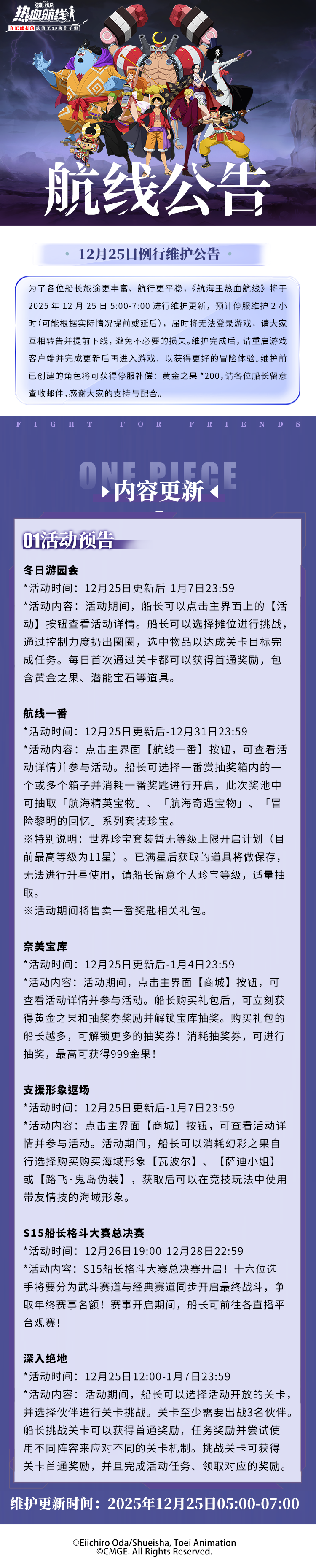 ⭐12月25日例行维护公告⭐为了各位船长旅途更丰富、航行更平稳,《航海王热血航线》将于2025年12月25日5:00-7:00进行维护更新,预计停服维护2小时(可能根据实际情况提前或延后),届时将无法登录游戏,请大家互相转告并提前下线,避免不必要的损失。维护完成后,请重启游戏客户端并完成更新后再进入游戏,以获得更好的冒险体验。维护前已创建的角色将可获得停服补偿:黄金之果*200,请各位船长留意