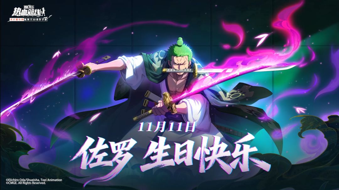 11月11日,祝佐罗生日快乐!登录游戏参与【为佐罗庆生】活动还可获取丰富的佐罗生日礼!一起来游戏内解锁三刀流的奥义吧~