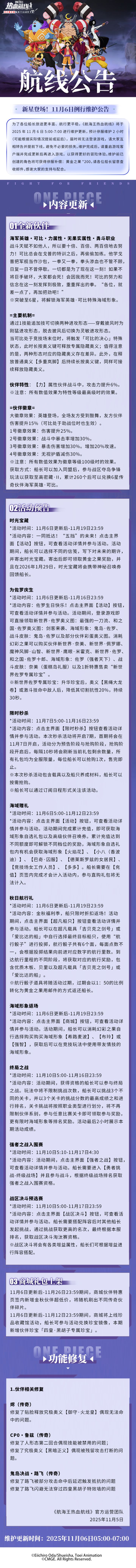 ⭐️11月6日例行维护公告⭐️为了各位船长旅途更丰富、航行更平稳,《航海王热血航线》将于2025年11月6日5:00-7:00进行维护更新,预计停服维护2小时(可能根据实际情况提前或延后),届时将无法登录游戏,请大家互相转告并提前下线,避免不必要的损失。维护完成后,请重启游戏客户端并完成更新后再进入游戏,以获得更好的冒险体验。维护前已创建的角色将可获得停服补偿:黄金之果*200,请各位船长留意