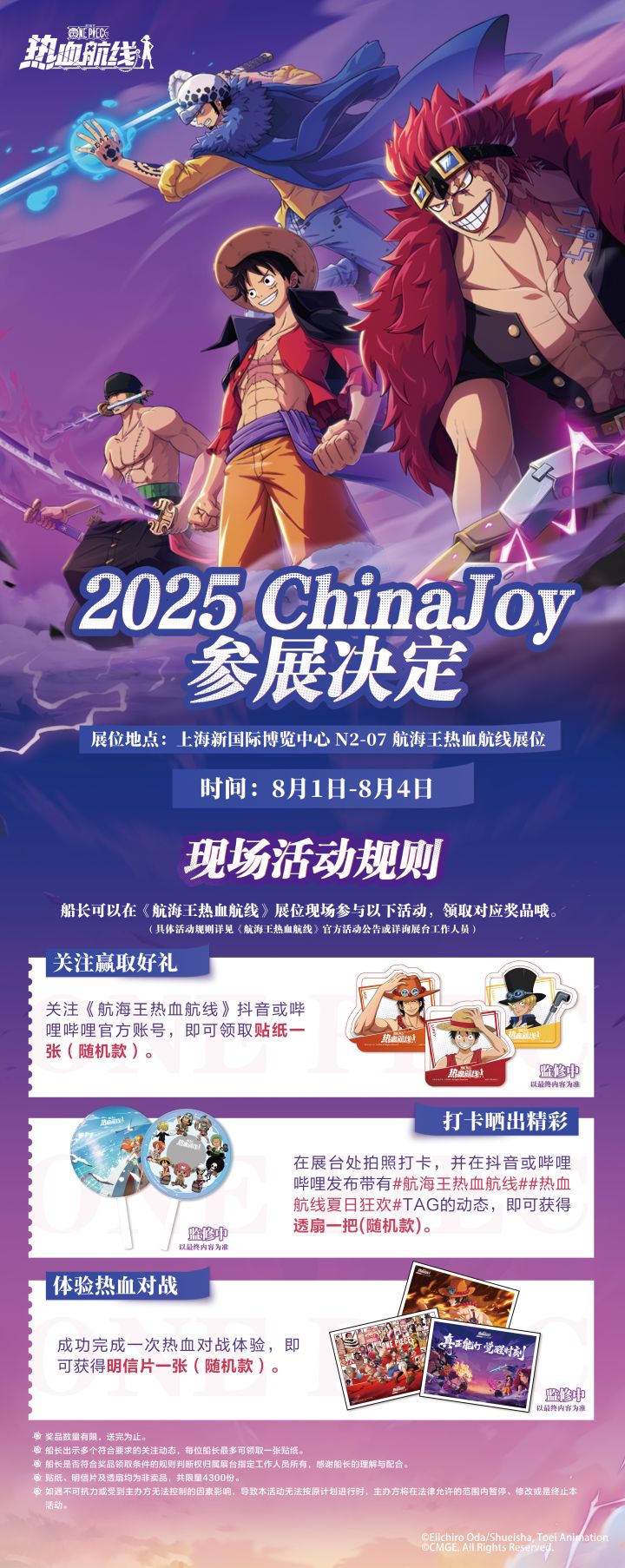 ⭐2025ChinaJoy参展决定⭐航海王热血航线即将登陆2025 ChinaJoy!亲临现场体验激斗,赢取独家航海限定好礼!8月1日-8月4日,让我们开启旅程,与船长们共赴盛宴!这个盛夏,让阳光与海风点燃你的冒险之魂,扬帆起航,驶向未知的惊喜海域!【展会时间】 2025年8月1日 - 8月4日【展会地址】 上海新国际博览中心【展位信息】 N2-07 航海王热血航线展位热血航线福利