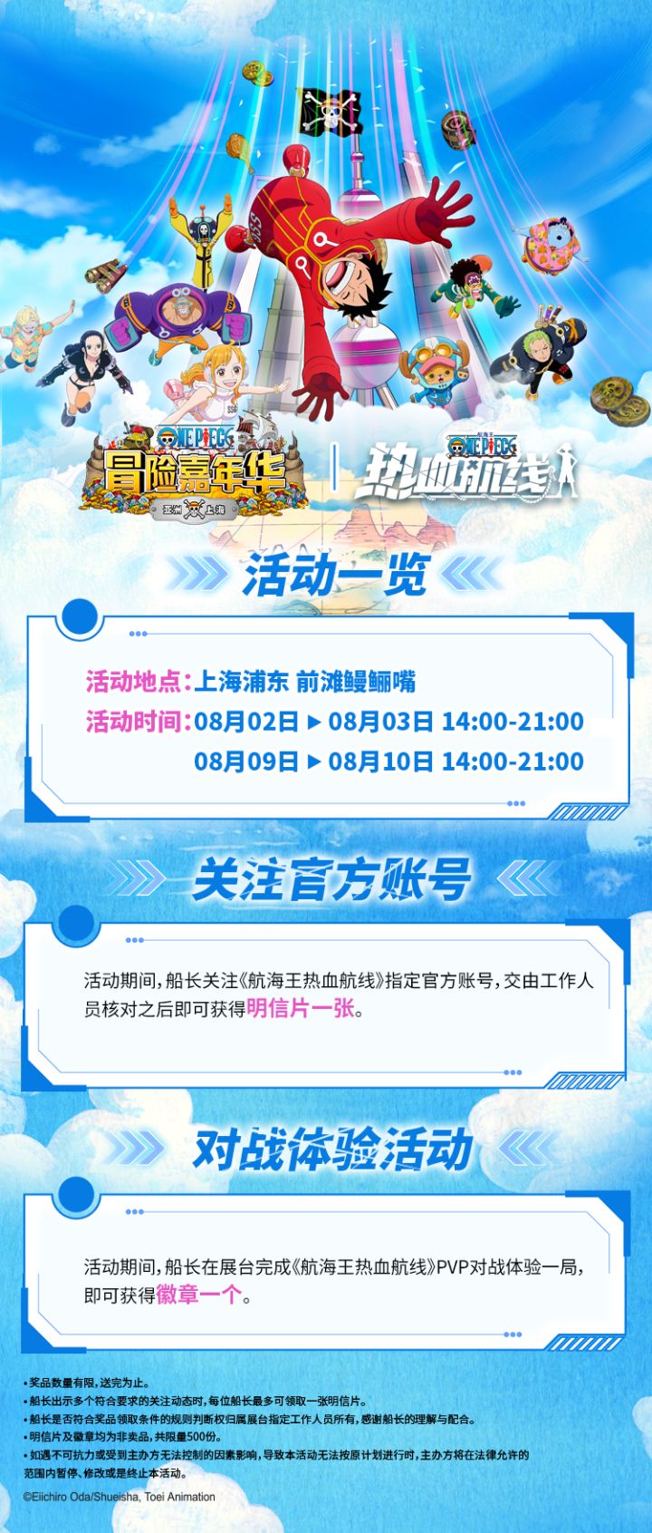 ⭐冒险嘉年华参展决定⭐航海王热血航线,全速驶入冒险嘉年华!亲爱的船长们,准备好迎接风浪了吗?航海王热血航线即将闪耀登陆冒险嘉年华!亲临现场,体验热血激斗,赢取限定好礼!⏰ 活动时间:8月2日-8月3日&8月9日-8月10日每日14:00-21:00📍 活动坐标:上海浦东 鳗鲡嘴滨江绿地冒险嘉年华《航海王热血航线》展位还有更多有奖活动等待船长们的参与,详情可点击长图查看或详询站台工作人员。