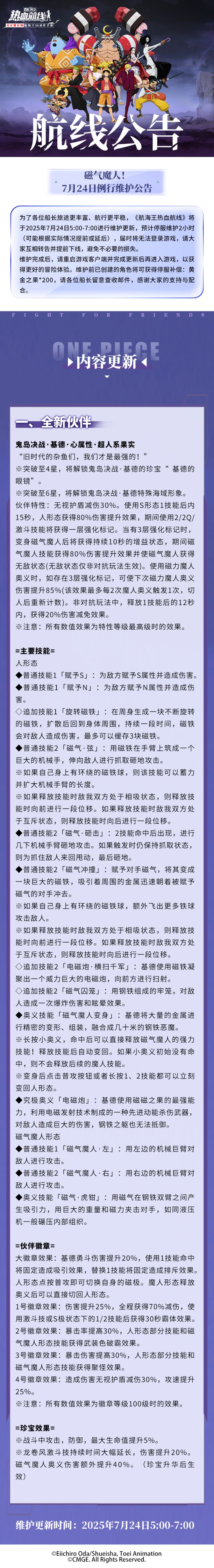 更新内容一览!每周例行维护,鬼岛决战·基德无畏前进,磁气之果火力全开!狂欢商店限时返场,全新传奇载具登场。热血单挑归来,拳燃盛夏,双模式排行榜大挑战!>>>全新传奇伙伴登场鬼岛决战·基德登场时间:7月24日12:00>>>更多活动鬼岛决战·基德无畏前进,强者祈愿限时开启,特殊海域形象完成任务即可领取!狂欢商店限时返场,传奇载具「海上餐厅巴拉蒂」与海域形象:大和(大口真神·兽)限时兑换!