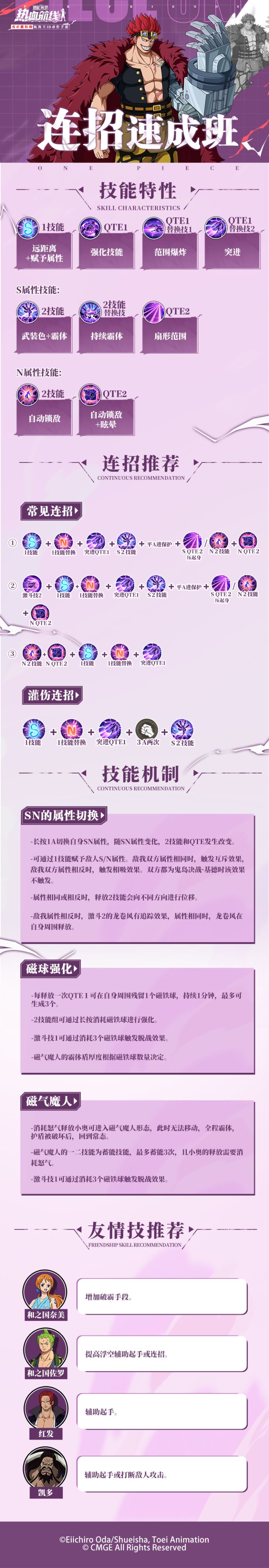 ⭐「鬼岛决战·基德」连招图⭐全新传奇伙伴鬼岛决战·基德现已登场!更多技能机制以及实战连招一图揭晓!复杂多变的机制,带来的是超高的实力上限!他可以通过向对手赋予N属性或者是S属性来配合攻击,拥有远距离、突进、武装色等多种强大机制。更可以通过奥义切换为磁气魔人,改变技能释放形态,增大技能范围!和乔小巴一起掌握伙伴更多战斗细节,在竞技场上一击制胜吧!热血航线福利官可雅酱堂堂登场!每月固定福利礼