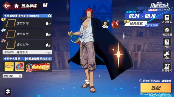 ⭐「热血单挑」活动预告⭐热血单挑限时活动即将开启!看真正能打的冠军究竟花落谁家?⭐活动时间:比赛时间:7月24日12:00-8月10日23:59领奖时间:8月10日02:00-8月13日23:59⭐活动规则:-本期热血单挑将采用武斗/经典双模式赛道,船长在任一模式中取得名次即可获得对应伙伴称号奖励!若双赛道均获得名次,可同时获得两个称号奖励。-活动期间内,船长可以选择不同的伙伴参与战