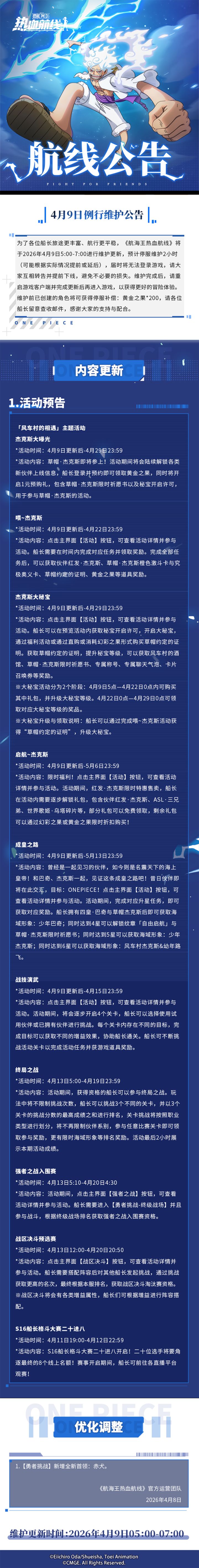 ⭐4月9日例行维护公告⭐为了各位船长旅途更丰富、航行更平稳,《航海王热血航线》将于2026年4月9日5:00-7:00进行维护更新,预计停服维护2小时(可能根据实际情况提前或延后),届时将无法登录游戏,请大家互相转告并提前下线,避免不必要的损失。维护完成后,请重启游戏客户端并完成更新后再进入游戏,以获得更好的冒险体验。维护前已创建的角色将可获得停服补偿:黄金之果*200,请各位船长留意查收邮件