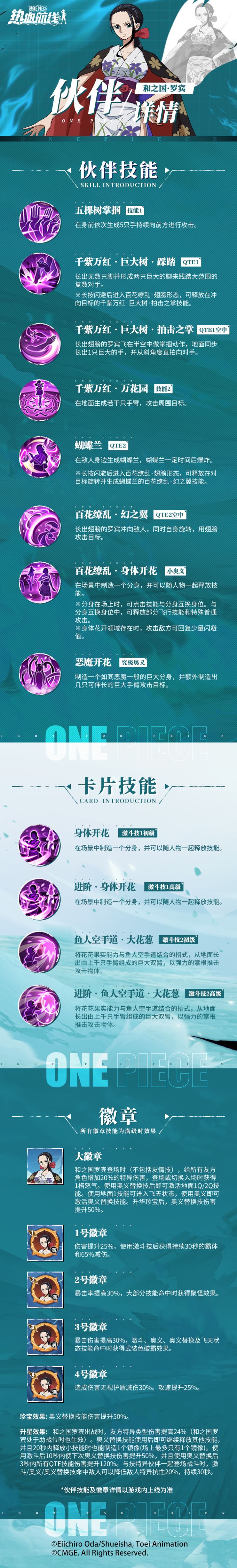 ⭐和之国·罗宾伙伴详情⭐全新技系传奇伙伴和之国·罗宾即将登场,伙伴技能详情与徽章详情展示!释放分身,瞬时切换,捉摸不透的罗宾还隐藏了哪些精彩技能等待揭晓?更多技能情报详见下图↓热血航线福利官可雅酱堂堂登场!每月固定福利礼包、不定期抽奖活动和神秘福利链接即将来袭!高招券、金果、贝里、还有实体周边等丰厚福利……可雅酱这里统统都有!赶快扫码添加吧!
