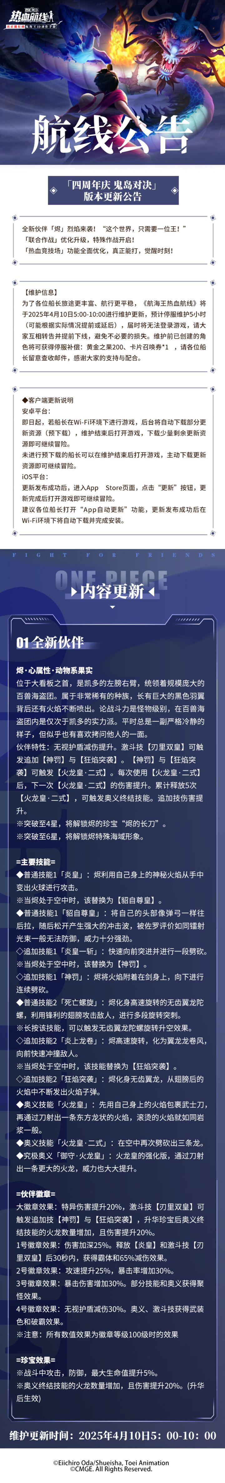 更新内容一览!全新版更来袭!烬烈焰来袭!热血竞技场全面优化调整,伙伴平衡性大调整!联合作战特殊关卡开启,还有周年庆超多福利即将上线!>>>全新传奇伙伴登场烬登场时间:4月10日12:00>>>系统更新热血竞技场功能全面优化调整,提升体验!联合作战全新特殊作战,海岛探险、海岛之试新增脱战功能!航线红包上线,悬赏金榜和各大杯赛新增红包奖励!>>>更多活动首充双倍重置,多倍奖励与胜场,