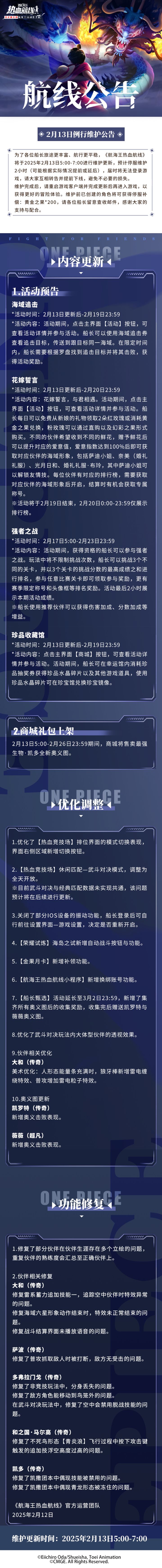 ⭐2月13日例行维护公告⭐为了各位船长旅途更丰富、航行更平稳,《航海王热血航线》将于2025年2月13日5:00-7:00进行维护更新,预计停服维护2小时(可能根据实际情况提前或延后),届时将无法登录游戏,请大家互相转告并提前下线,避免不必要的损失。维护完成后,请重启游戏客户端并完成更新后再进入游戏,以获得更好的冒险体验。维护前已创建的角色将可获得停服补偿:黄金之果*200,请各位船长留意查收