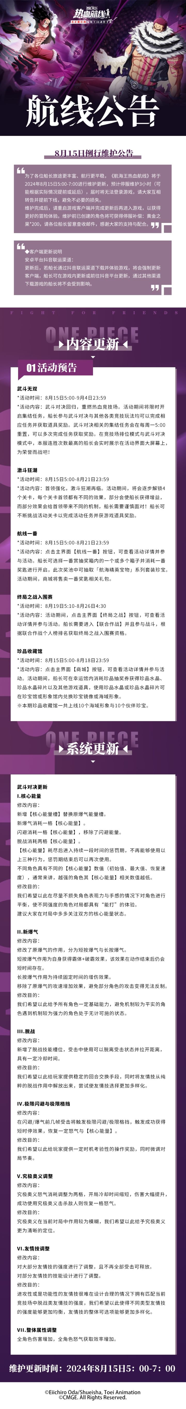 ⭐影游联动!8月22日不停服更新公告⭐为了各位船长旅途更丰富、航行更平稳,《航海王热血航线》将于2024年8月22日4:45-5:00间进行不停服更新,如遇无法登录游戏、强制下线、无法进入战斗等情况,重启游戏客户端并等待更新完成后即可进入游戏、正常游玩。↓↓↓更新详情如下↓↓↓
