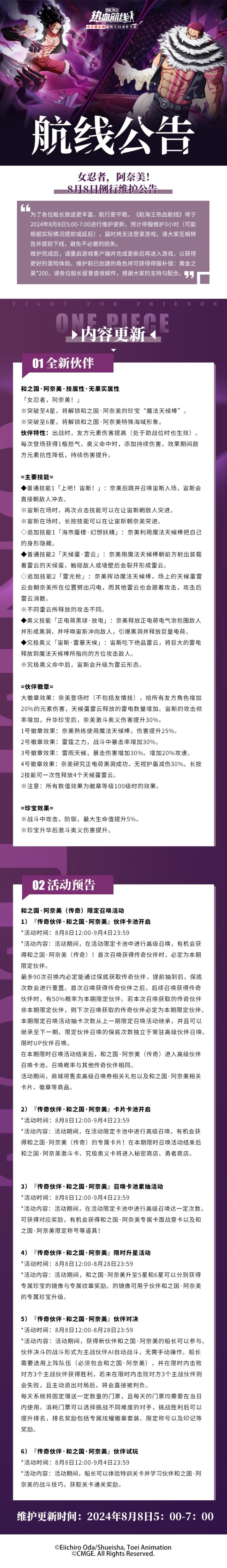⭐女忍者,阿奈美!8月8日例行维护公告⭐为了各位船长旅途更丰富、航行更平稳,《航海王热血航线》将于2024年8月8日5:00-7:00进行维护更新,预计停服维护2小时(可能根据实际情况提前或延后),届时将无法登录游戏,请大家互相转告并提前下线,避免不必要的损失。维护完成后,请重启游戏客户端并完成更新后再进入游戏,以获得更好的冒险体验。维护前已创建的角色将可获得停服补偿:黄金之果*200,请各位