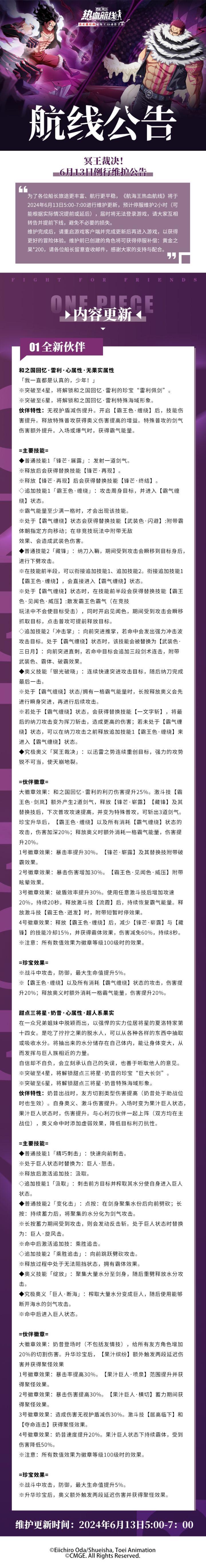 ⭐冥王裁决!6月13日例行维护公告⭐为了各位船长旅途更丰富、航行更平稳,《航海王热血航线》将于2024年6月13日5:00-7:00进行维护更新,预计停服维护2小时(可能根据实际情况提前或延后),届时将无法登录游戏,请大家互相转告并提前下线,避免不必要的损失。维护完成后,请重启游戏客户端并完成更新后再进入游戏,以获得更好的冒险体验。维护前已创建的角色将可获得停服补偿:黄金之果*200,请各位船