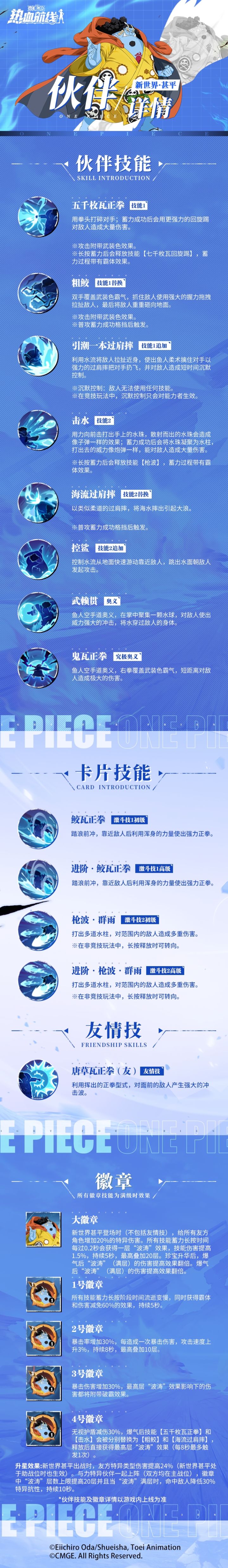 ⭐新世界·甚平技能详情⭐身为鱼人族的一员,擅长“鱼人空手道”和“鱼人柔术”的他,可以利用海水对敌人造成多种威力强大的冲击或控制!5月16日,全新传奇伙伴新世界·甚平即将登场,一起来看看他的技能和徽章详情吧!更多伙伴详情见下图↓